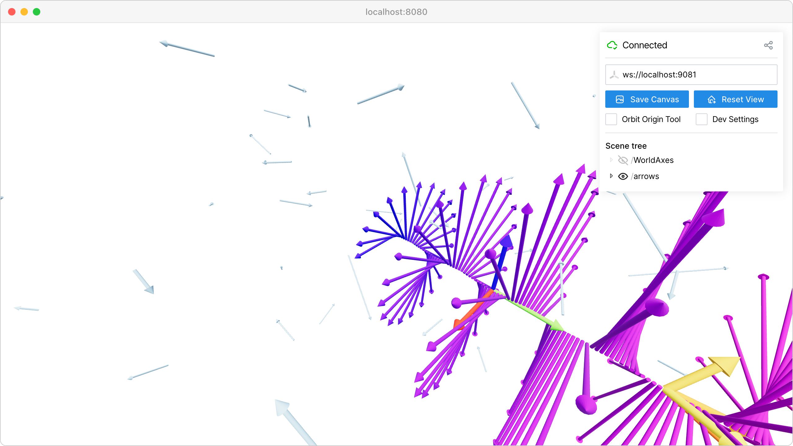 This example demonstrates viser’s arrow rendering capabilities, which are useful for visualizing directions, forces, velocities, and other vector quantities common in robotics and computer vision applications.